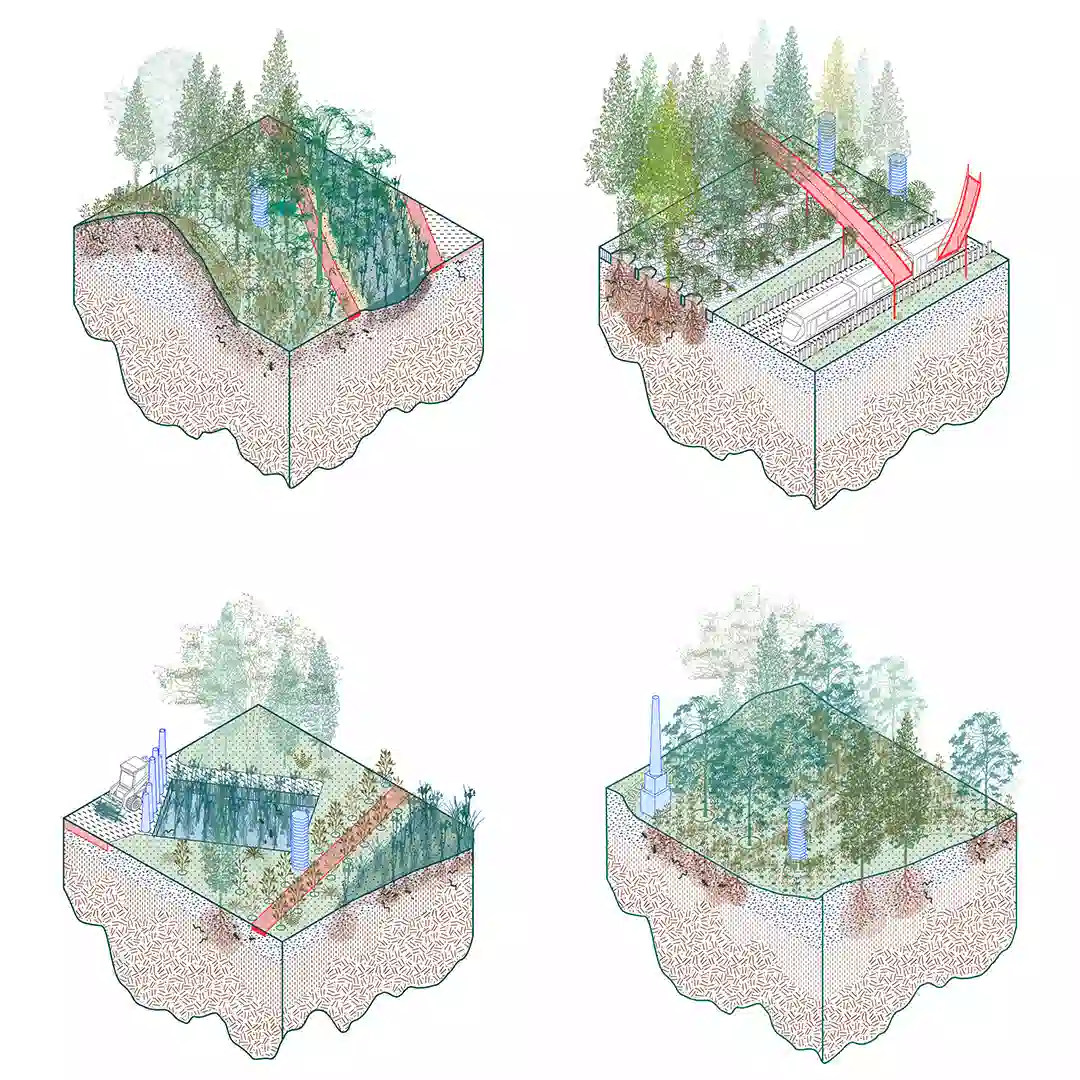 Working within a long-term transitional time interval and starting from this idea, the project intends to activate a gradual process of non-humans-remediation and caring, activating a regenerative process capable of actuating a landscape metamorphosis which, after having been sedimented and spread, gives back a reclaimed landscape to much more responsibilized humans.