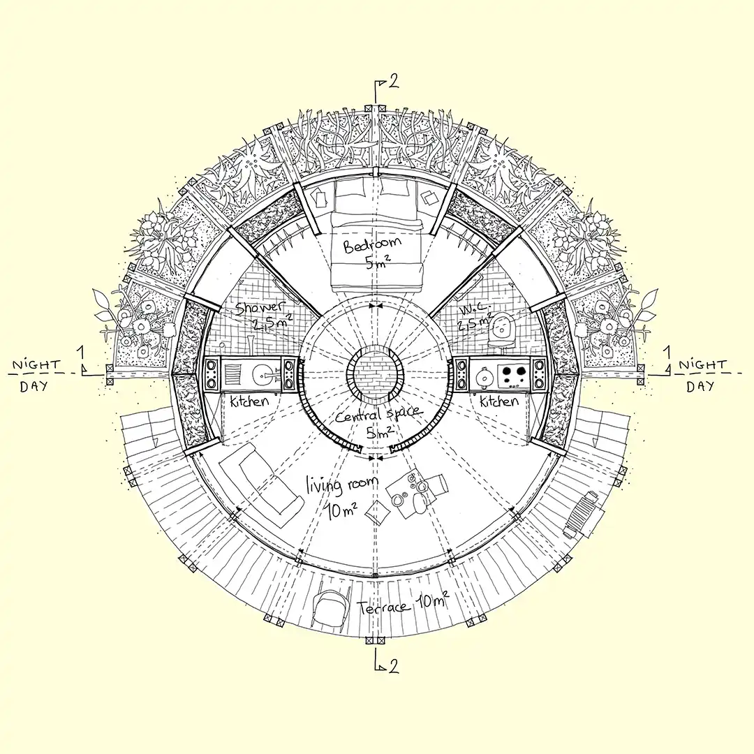 El plano circular está dividido en 2 partes. Una zona de noche que incluye dormitorios, duchas y aseos. Una zona de día que incluye el salón, que puede abrirse totalmente a la terraza exterior. Las 2 zonas de estar están separadas por 2 muebles que integran los conductos técnicos conectados a la cocina y a los cuartos húmedos.