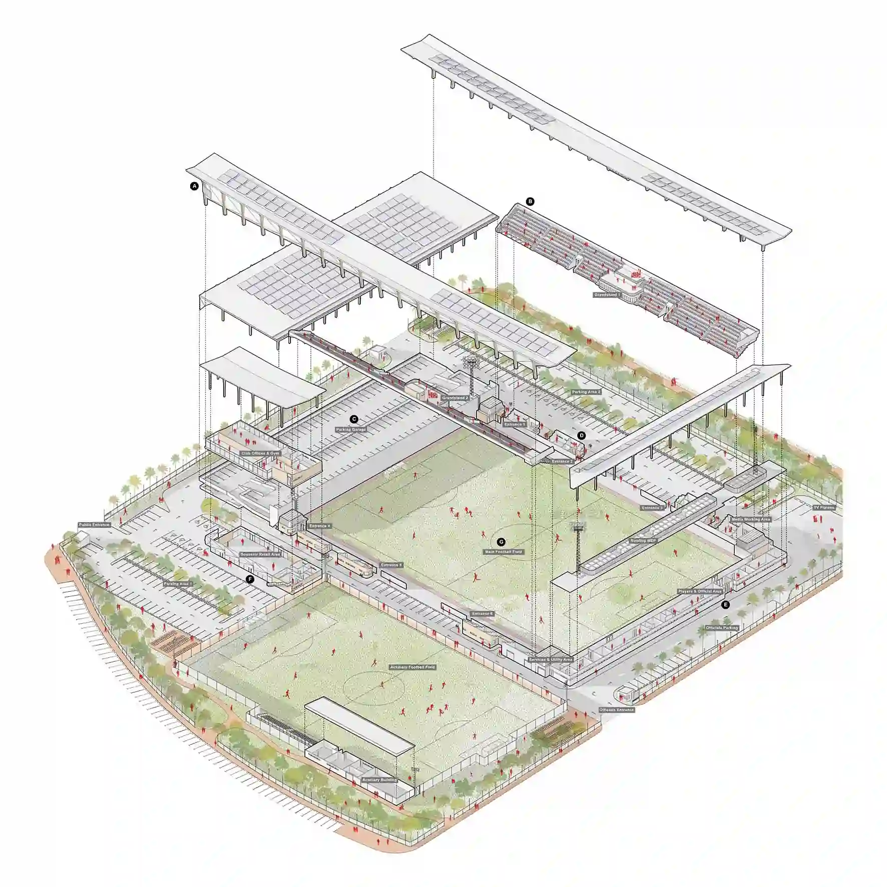 In that sense, the proposal introduces the new sport complex and city stadium as a vessel to channel between this polarised spectrum. From the scale of a sport complex down to the stadium, the design concept reflects the notion of ‘horizontality’ to encapsulates a range of textures resembled in various materials.